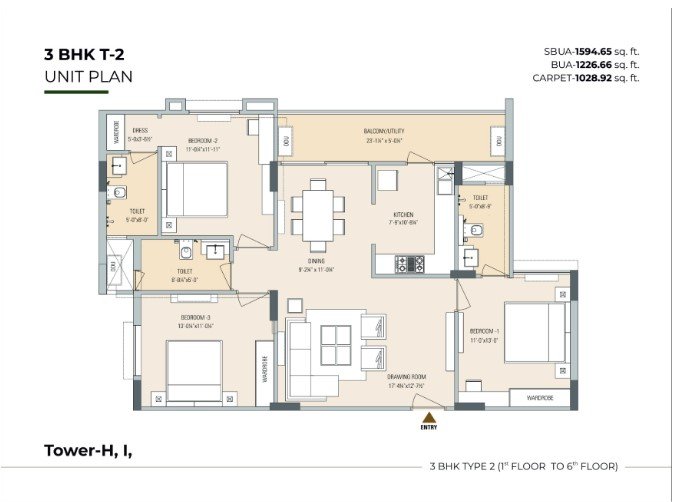 - Floor – Vitrifeid Tiles ( Glazed/Johnson/Kajaria/Equivalent)