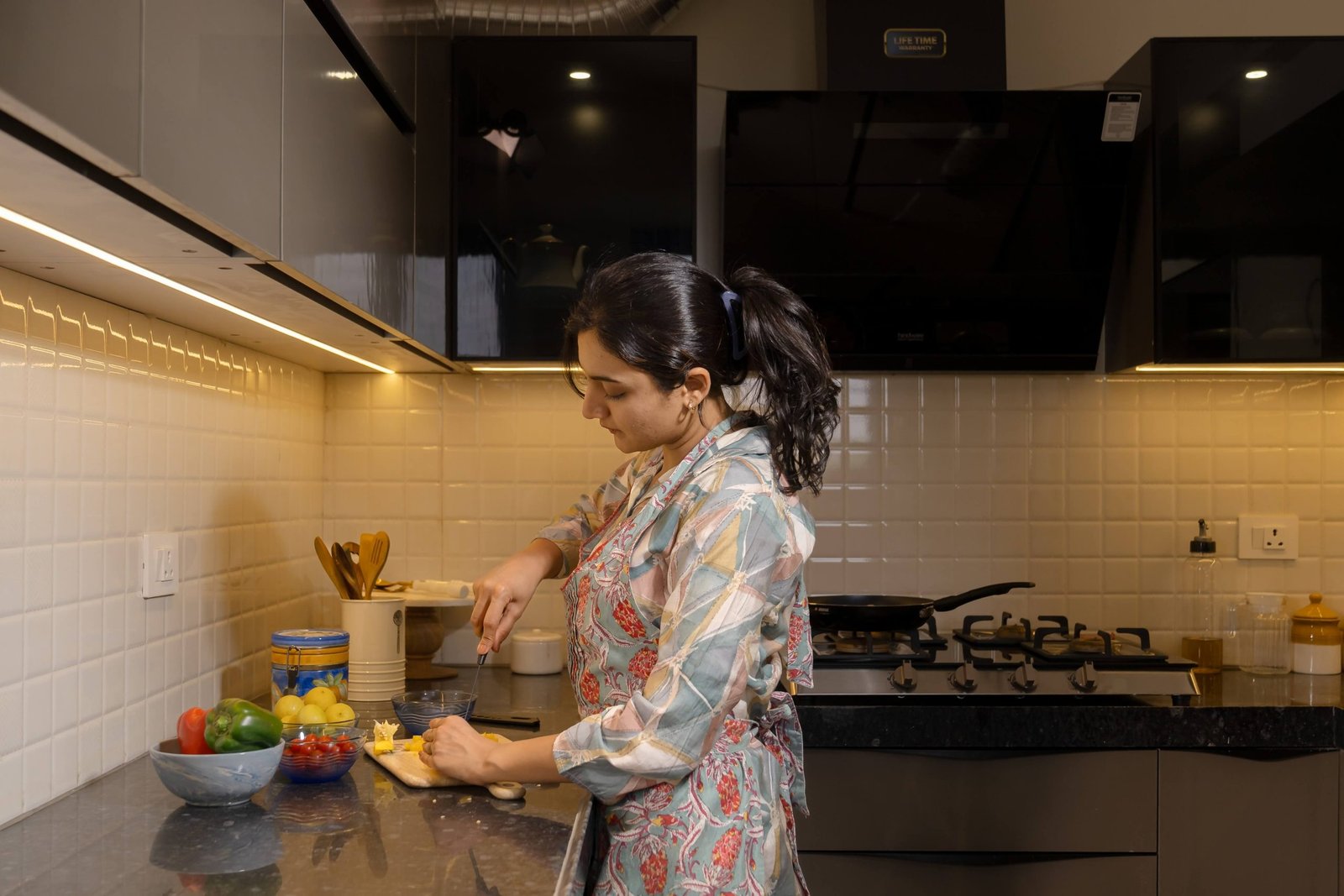 - Counter – 2′ Wide Granite Counter Top , 2′ Dado Tiles Above Counter ( Black/Green/Red Granite Johnson/Kajaria/Equivalent)